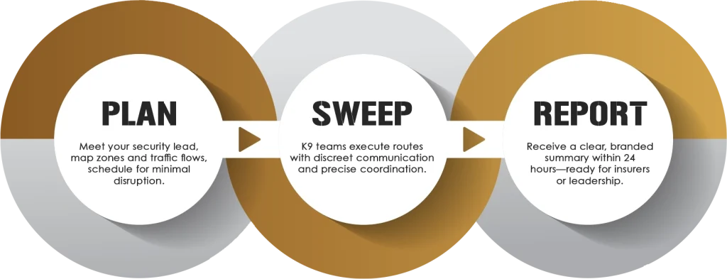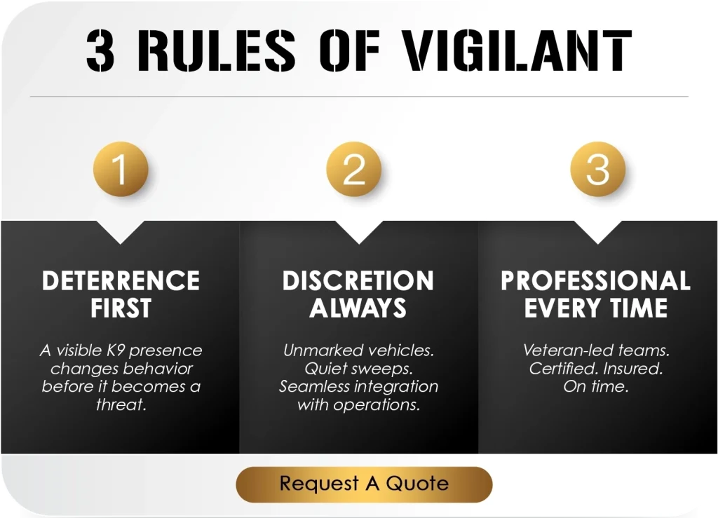 Every environment carries unique risks—and unique responsibilities. Whether it’s a stadium, a refinery, or a private home, Vigilant K9 adapts to the context with calm precision. We don’t show up loud. We show up prepared. Each program below is built to solve real problems for real people—the decision makers responsible for keeping others safe.