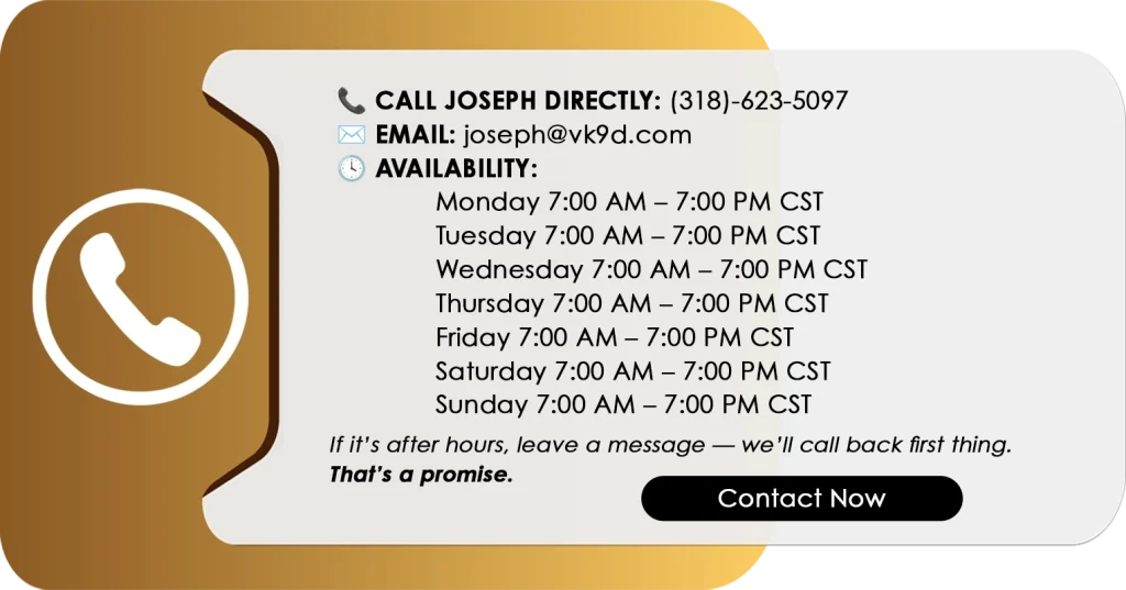 Within one business day, we’ll reach out to confirm your request, schedule a call or sweep, and answer any questions. You’ll talk directly with a Vigilant K9 team member — no middlemen, no scripts, no waiting weeks for a quote. If we’re not the right fit, we’ll tell you honestly and point you in the right direction. Integrity matters more than closing a sale.